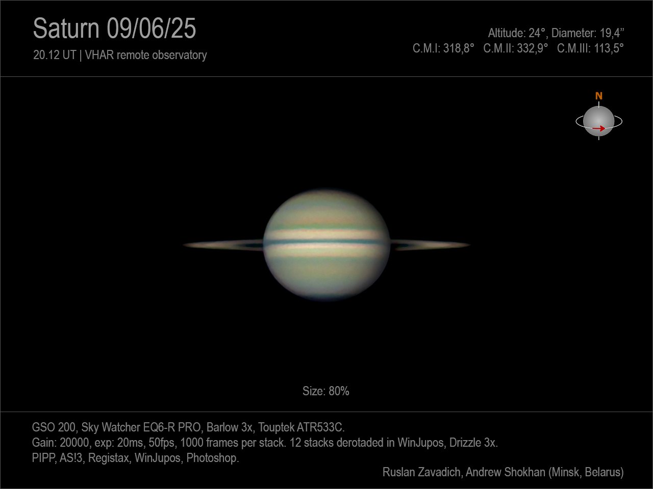 2-х часовая анимация от 19/09/2025. Снимал с надеждой увидеть неоднородности полос на диске. Титан справа под кольцом.