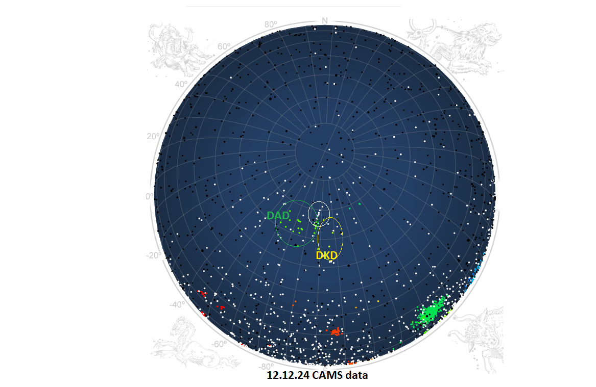 Ради любопытства глянул данные СAMS за 2024 год. В той же области неба заметна цепочка неклассифицированных радиантов между DAD и DKD. Данные GMN на тех же долготах в 2024 году показывают ту же вытянутую структуру радиантов, только наблюдений меньше (в 2024 г у GMN было меньше камер). Кстати, радиант DKD очень диффузный, практически граничит с DAD, который также весьма диффузен. Это может быть проявлением субрадианта DAD или DKD, тем более Vg метеоров у всех трех радиантов схожее.