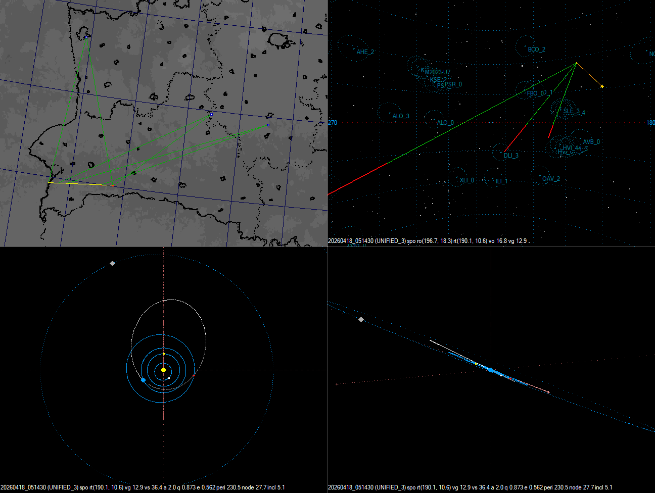 Детектирование началось на высоте 92.6 км. На 16-й секунде на высоте 87.6 км метеороид прошел ближайшую к Земле точку. На высоте 89.7 он был потерян нашими камерами из-за удаления объекта и падения яркости, хотя на тот момент он еще не погас. Несомненно, он продолжил свой путь дальше в Солнечной системе.