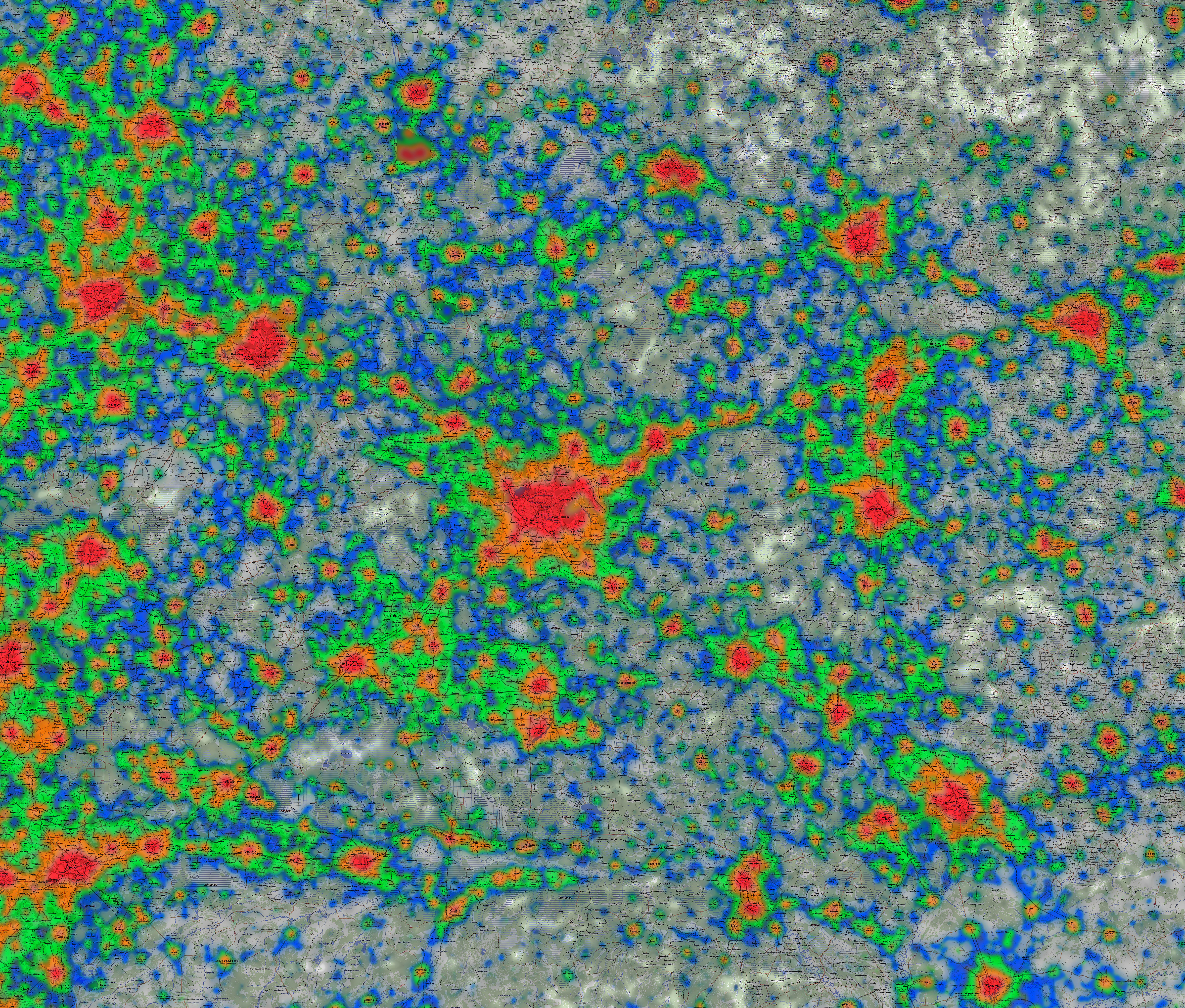 Сама карта пока выложена тут: "Карта ночных огней Беларуси. 2012 г. ИСЗ "Suomi NPP" (16,6 Мб). Вариант в другой цветовой градации: [ТУТ] (12 Мб). Цвета условные.
