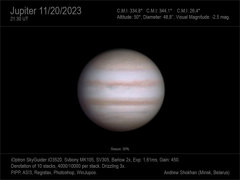 Юпитер снятый на выезде с Alexander в ночь с 20 на 21е число. С атмосферой была совсем беда. Визуально можно было рассмотреть только полосы. Протестировал 2х линзу на маке. Фокусируется отлично, идеальная связка с этой камерой. В этот раз попытался снимать на более высоком gain (450) и маленькой экспозиции. Фпс разогнал, но мне показалось, что 450 для такой конфигурации сетапа многовато для этой камеры. С шумами пришлось повозиться. Все же попробую нащупать золотую середину и в след раз не повышать чувствительность выше 350, пусть и в ущерб фпс.