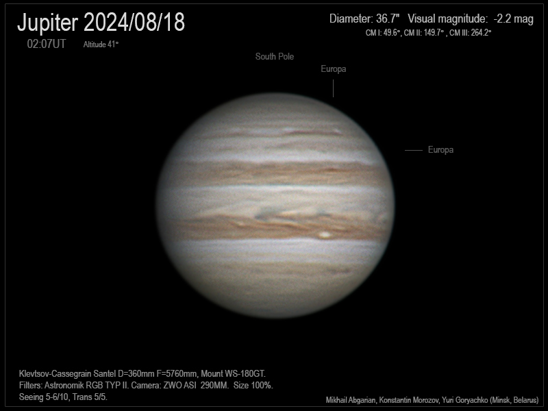 Сложение 1200 кадров в AS! , деротация в WinJupos, вейвлеты в Registax 6, финализация в Фотошоп.