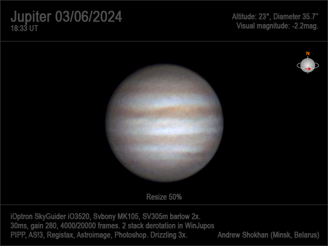 Мой хреновенький Юпитер за 6 марта. Атмосфера была вроде и ничего, но низко над горизонтом, немного неточная фокусировка, поэтому результат посредственный абсолютно.