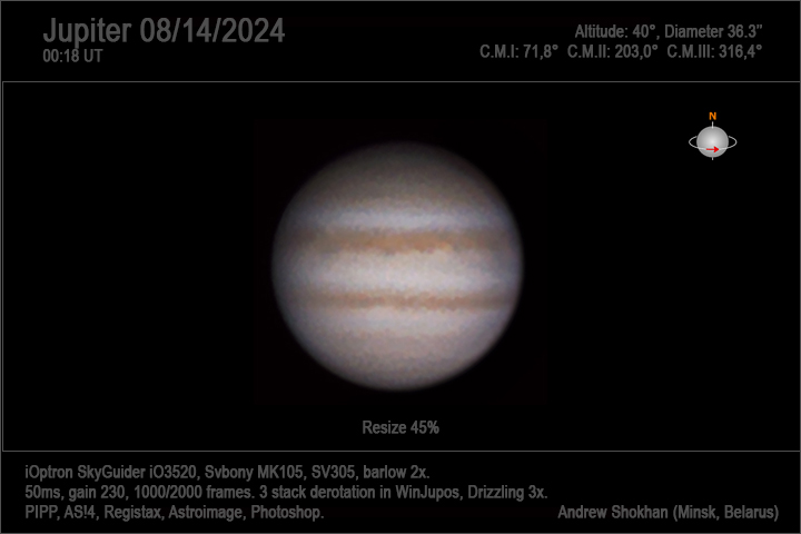Юпитер за 14 августа. Из 6 роликов более менее атмосфера словилась только на последнем. Поэтому при деротации фактически использовался 1 ролик и только 2 других подмешал с минимальным значением для небольшого усреднения шума.