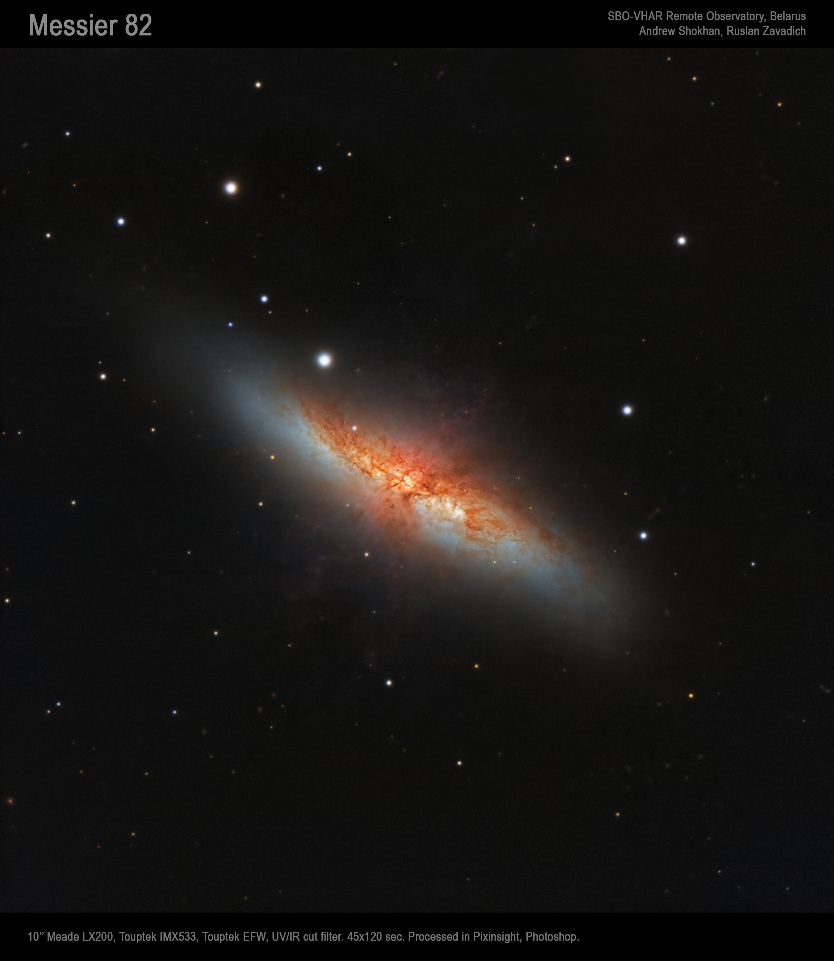 Поехал я как то снимать "Боде" и "Сигару", но был без искателя и промазал. В итоге получил не менее интересные галактики. Забавно, что они видны почти под теми же углами, что и M81 и M82.