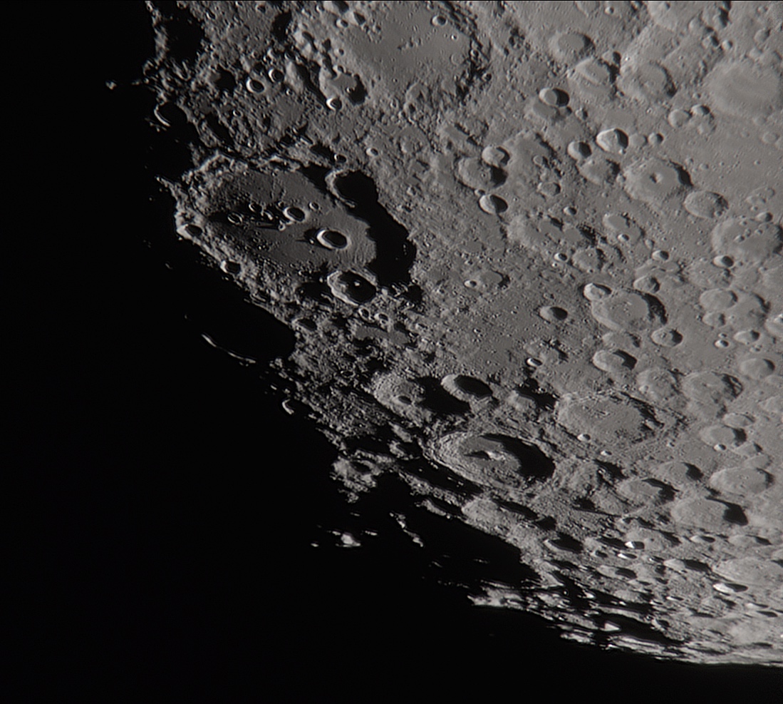 В качестве иллюстрации первого успешного применения – вчерашняя Луна, собранная из 18 фрагментов. Seeing был плохой и для "обкатки" программы в разных режимах снимал мало кадров (1000 на фрагмент), так что снимок чисто технический, без “вылизывания”.