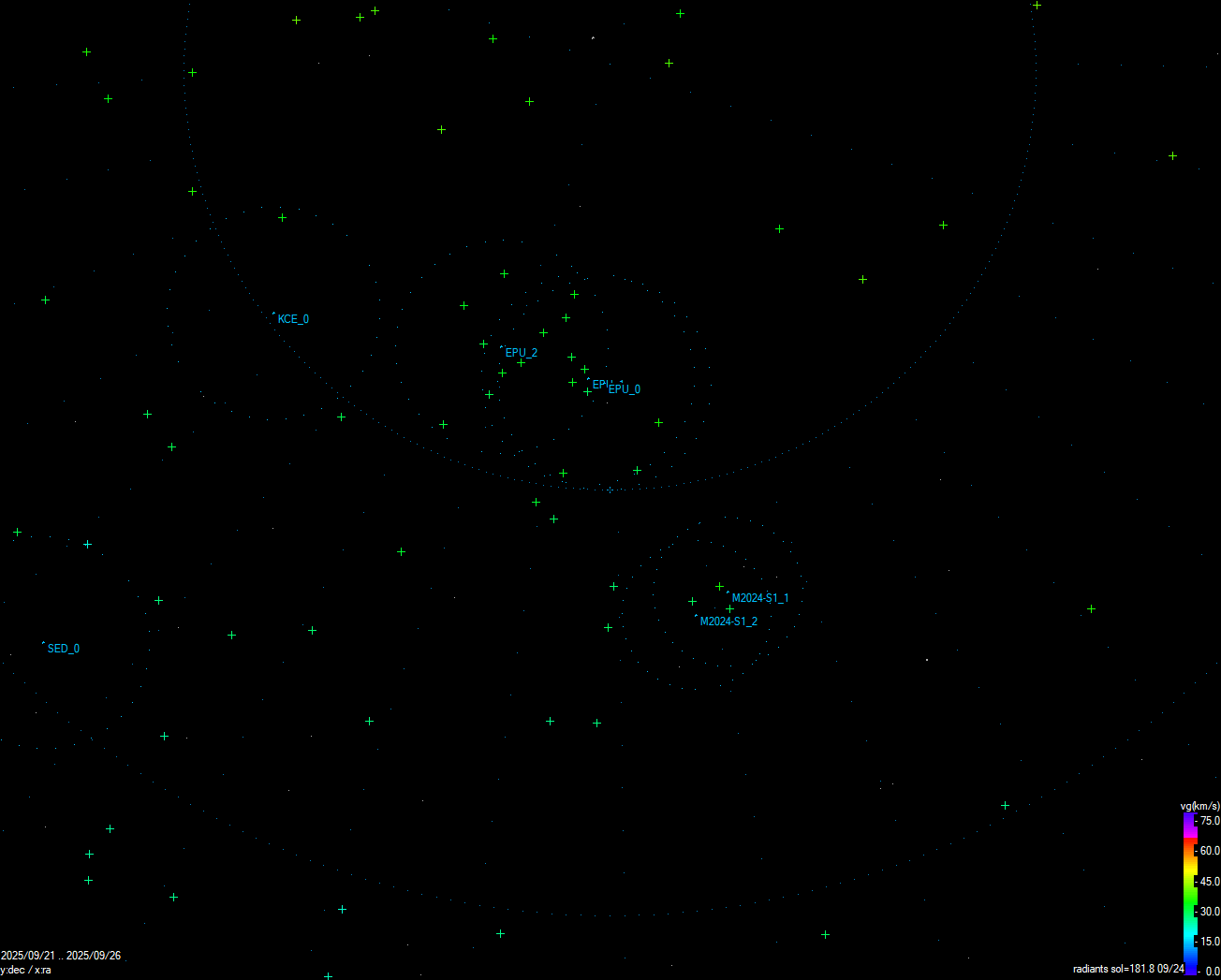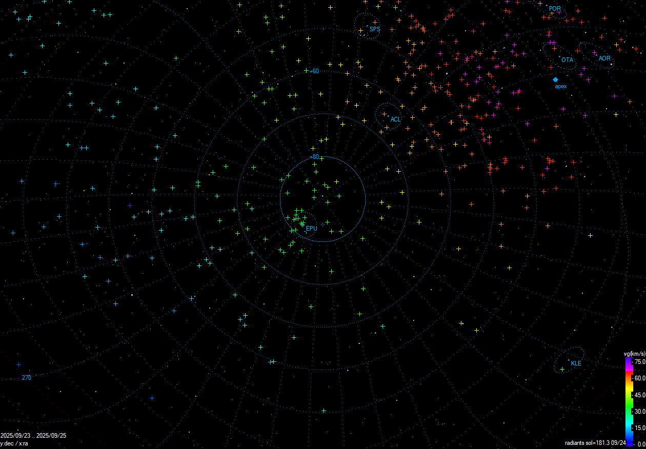 Кстати, проверяя свои визуальные метеоры с данными CAMS на предмет принадлежности к тем или иным потокам, обнаружил скопление неклассифицированных радиантов 22-25 сентября. Скорее всего наблюдалась вспышка активности потока EPU#1044. Но CAMS его не детектирует, в отличие от GMN , у последней побольше видеокамер , только в Европе их около 600. Возможно появится статья об этом от кураторов GMN или все-таки CAMS.