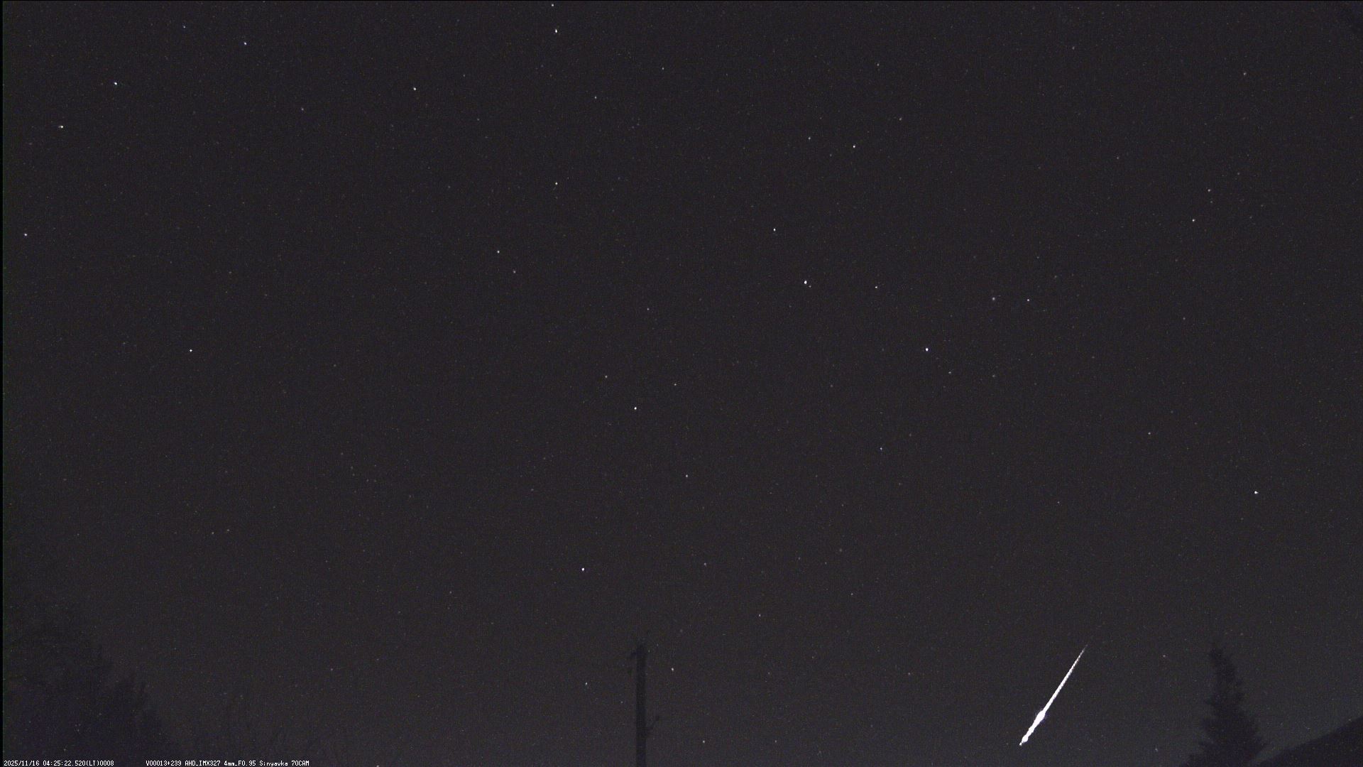 16.11.2025 в 4:25 по мозырскому времени был метеор. Летел из региона Близнецов, погиб в созвездии Гидра недалеко от Альфарда. Два раза "чиркнул атмосферу", оставив след по своей траектории движения.