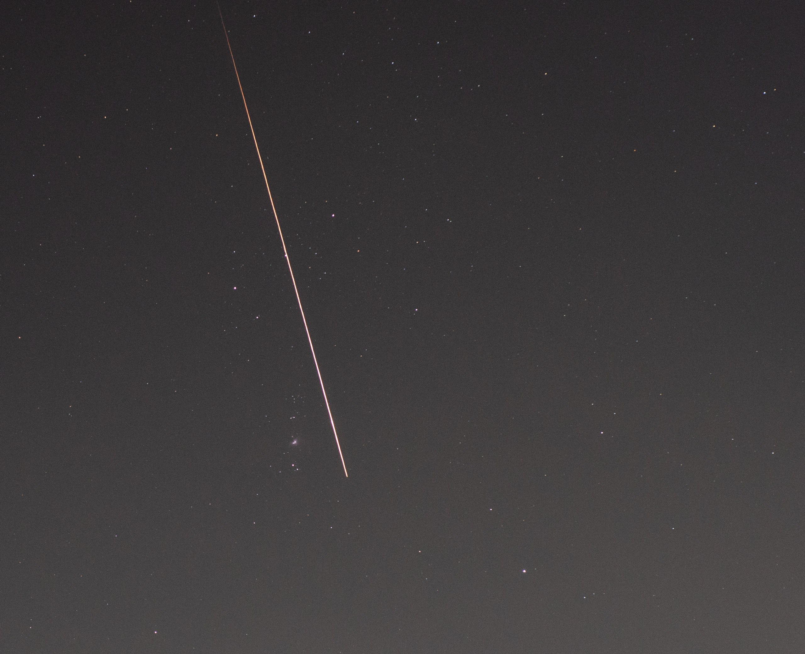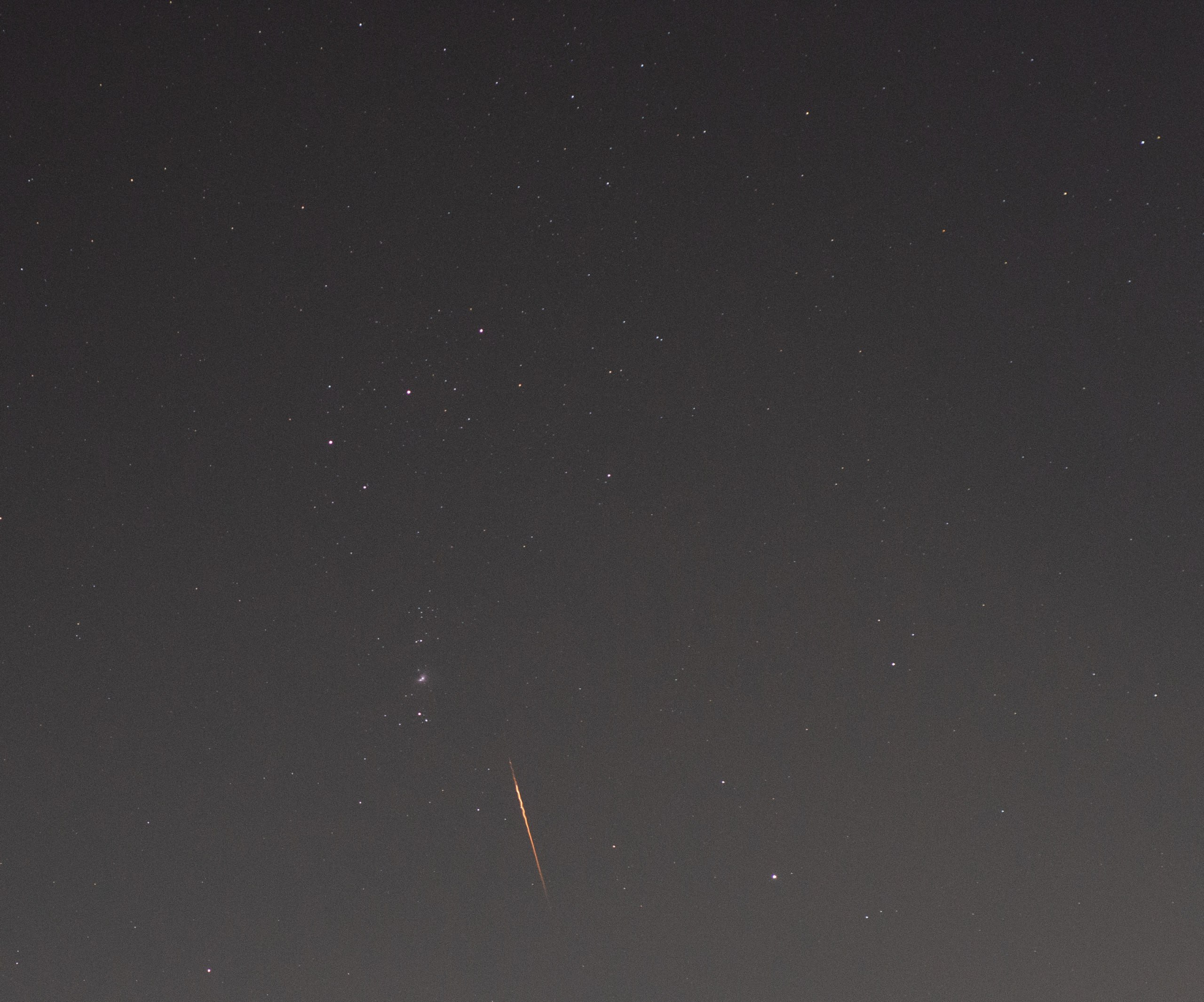 Во время стека Ориона 8 января 2025 г, 20:53 UTC зафиксировал метеор. Так повезло, что метеор упал под конец первого кадра и вследствие этого отобразился на двух кадрах.