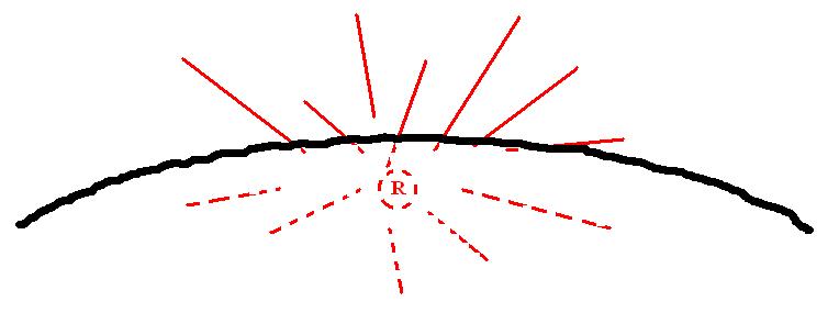 Если радиант ниже горизонта, то нам всё равно будет видна менее 50% от общего числа метеоров (красные пунктиры -- метеорные следы под горизонтом, R -- положение радианта):