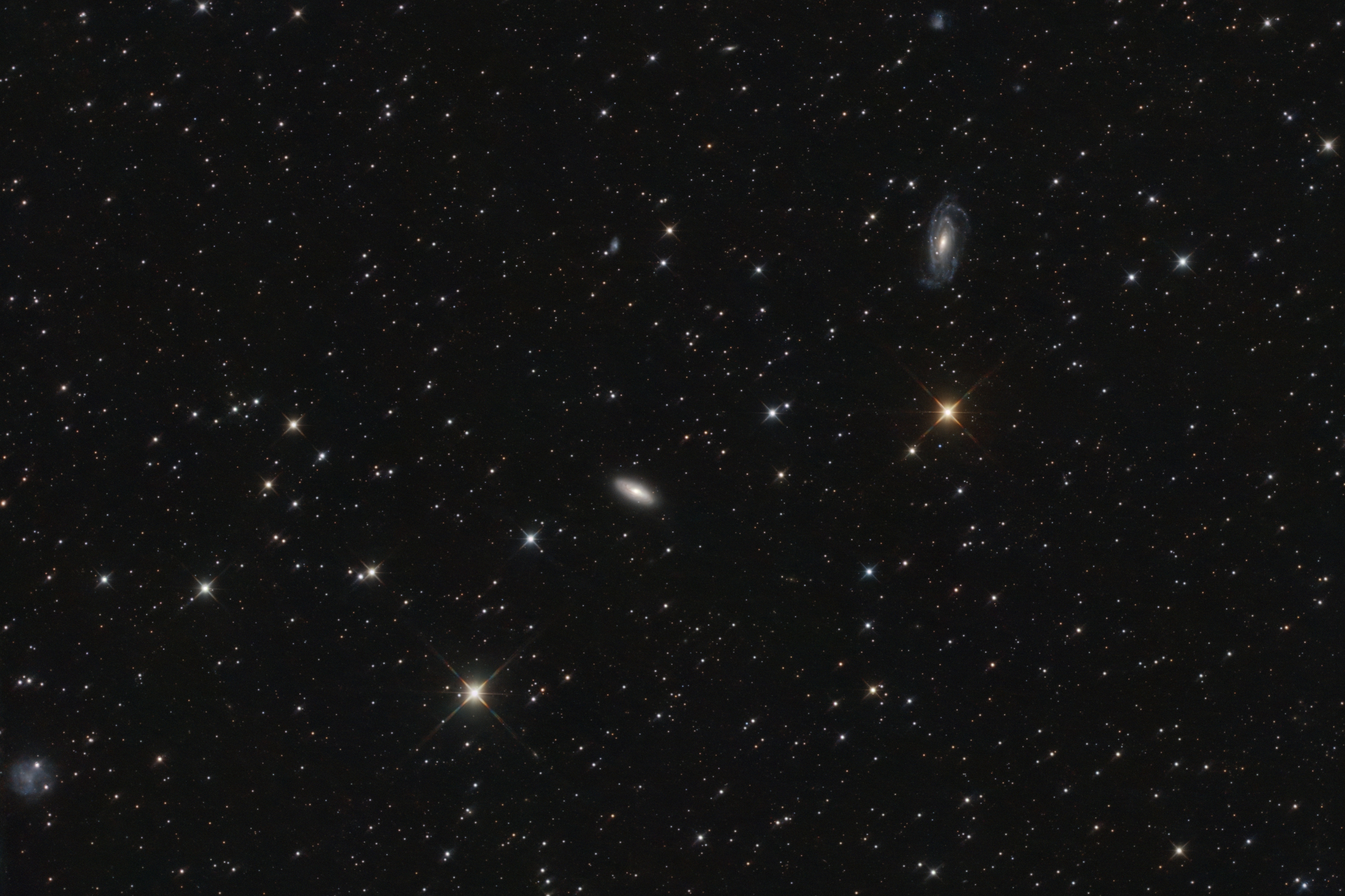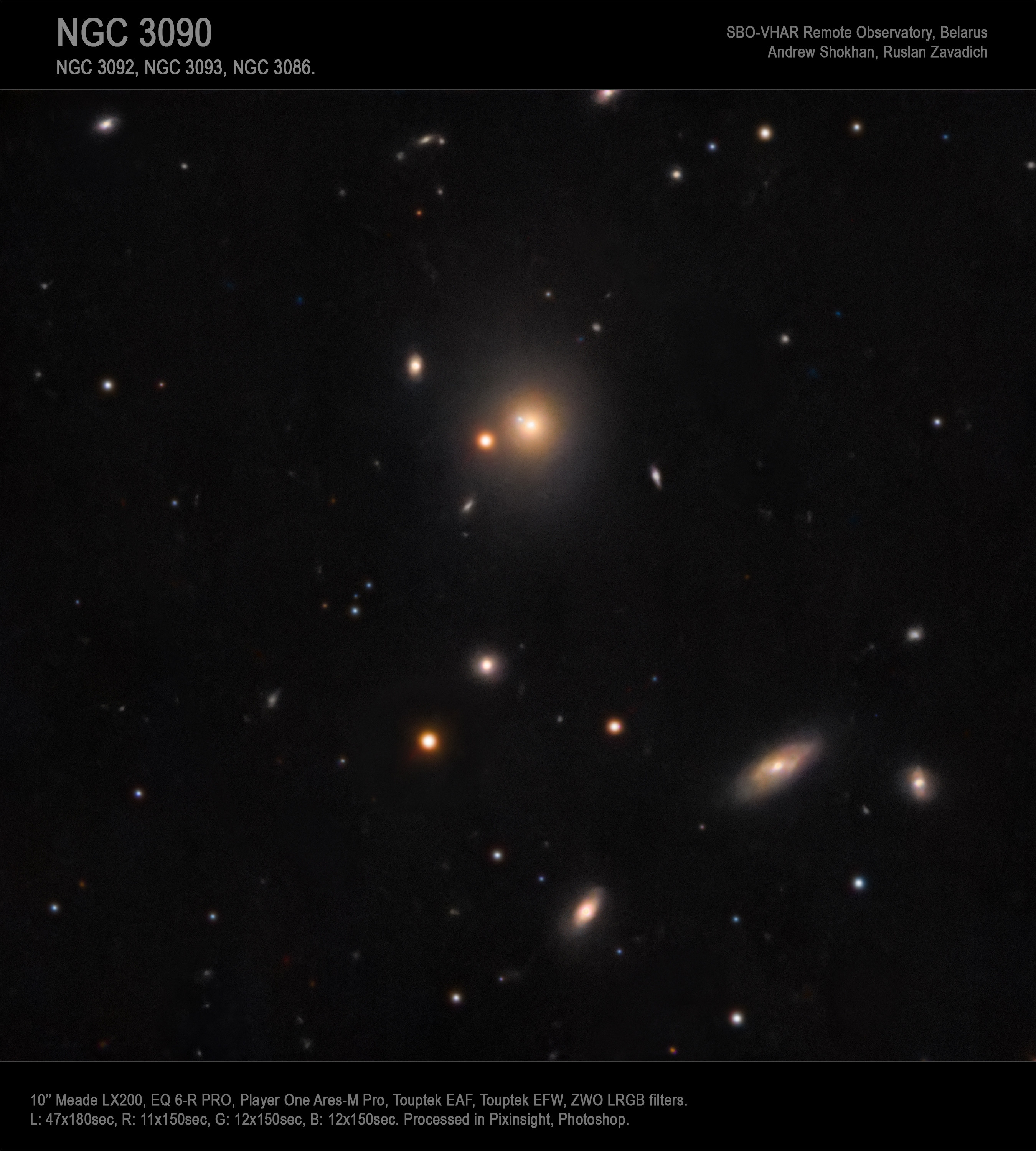 Закончили с Sidewinder паузу, врываемся с такой вот интересной группой галактик вокруг NGC 3090. Очень небольшое окошко есть по времени поснимать хоть какой-то дипскай в Секстанте из Беларуси, поэтому отличный экземпляр в копилку. Да и снимков этой области в интернете крайне мало. Снято в середине марта. В яркостном канале еще влезала NGC3086, но в цветных частично обрезалось. А еще... А еще кое что интересное, связанное с этим снимком мы вам покажем очень скоро. Надо немножко потерпеть :)