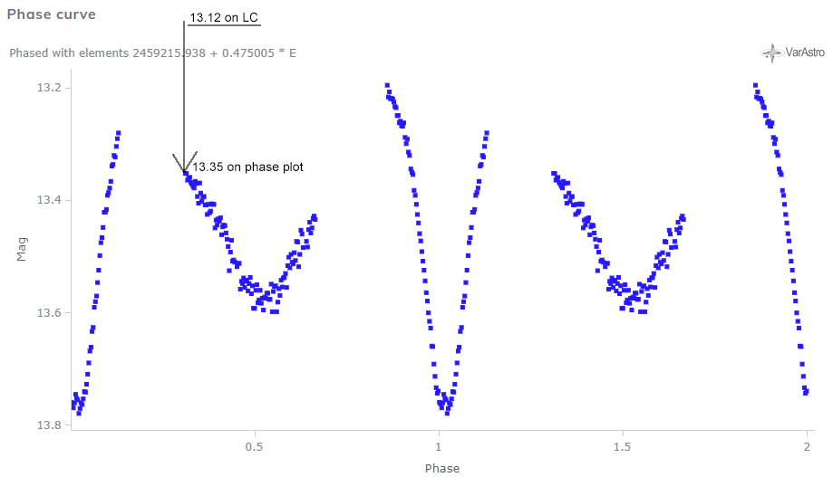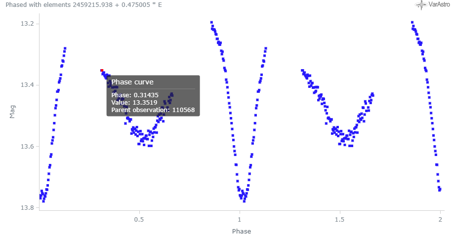 Однако точки вторичного минимума на фазовой диаграмме VarAstro почему-то съехали вниз. Причину понять не могу, т.к. кривую блеска VarAstro рисует верно (т.е. дело не в фотометрии).