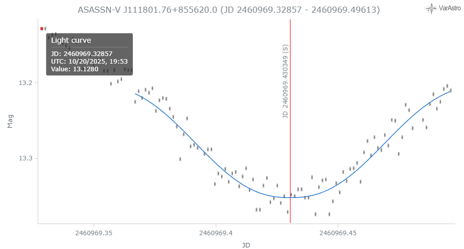 | AMIF писал(а): | Не могу понять, почему на фазовой кривой точки вторичного минимума ASASSN-V J111801.76+855620.0 оказались заметно смещены вниз от исходной кривой блеска.