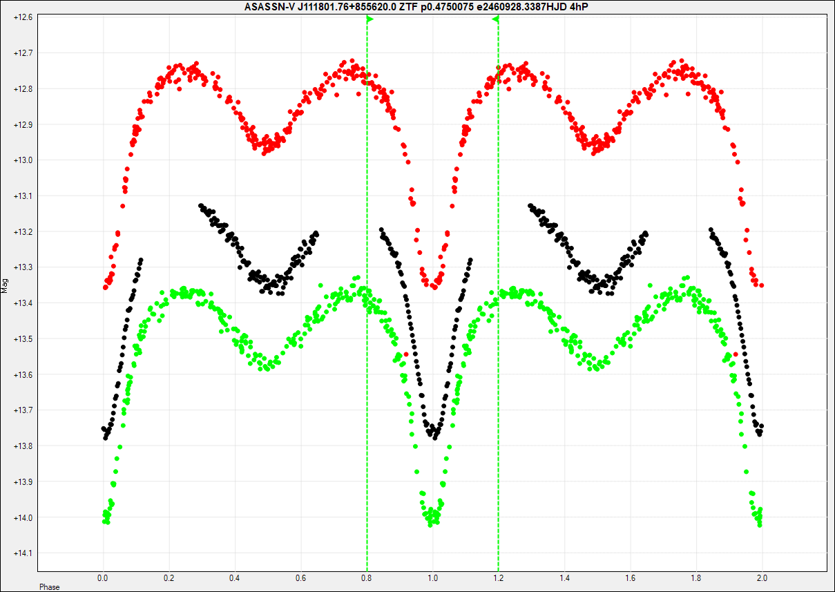 Не могу понять, почему на фазовой кривой точки вторичного минимума ASASSN-V J111801.76+855620.0 оказались заметно смещены вниз от исходной кривой блеска.