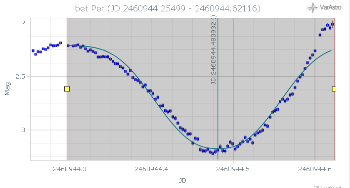 В ночь с 26 на 27 сентября отнаблюдал затмение bet Per c помощью патрульной олл-скай камеры. Cнимал, как всегда Canon 400D, ISO 400, exp. 30 s., включенный шумодав, автосложение скриптом в Maxim DL по 4 снимка. Мой результат хорошо согласуется с общим трендом точек O-C(Epoch) на графике чехов (красная точка). Погрешность фотометрии на уровне 0.03, что неплохо для олл-скай камеры. Особенность фотометрии на таких больших полях - отсутствие автоматического подхвата изображений звезд, т.е. весь ансамбль звезд сравнения приходилось показывать софту вручную.