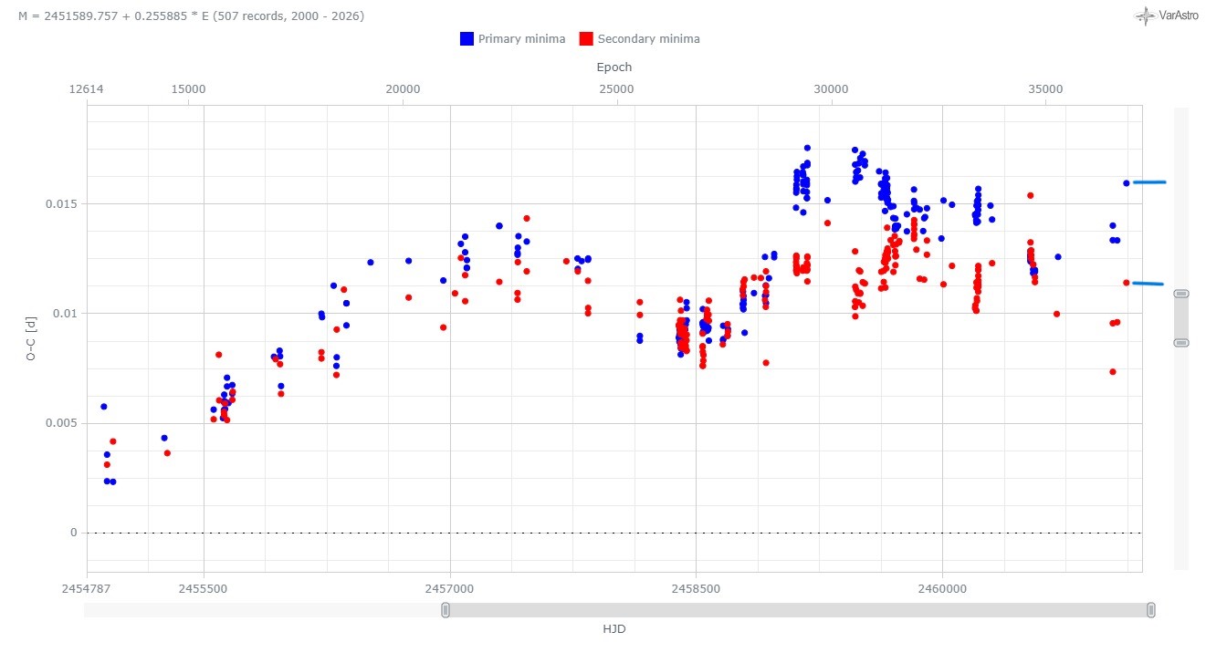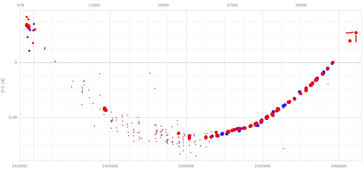 В ночь с 14 на 15 марта отнаблюдал вторичное затмение GK Cep. Момент минимума наступил на 37 минут позже расчетного, что отлично совпадает с данными наблюдателей проекта VarAstro (красная точка с рисками на графике O-C(HJD). Лист наблюдений звезды: https://var.astro.cz/en/Stars/11628